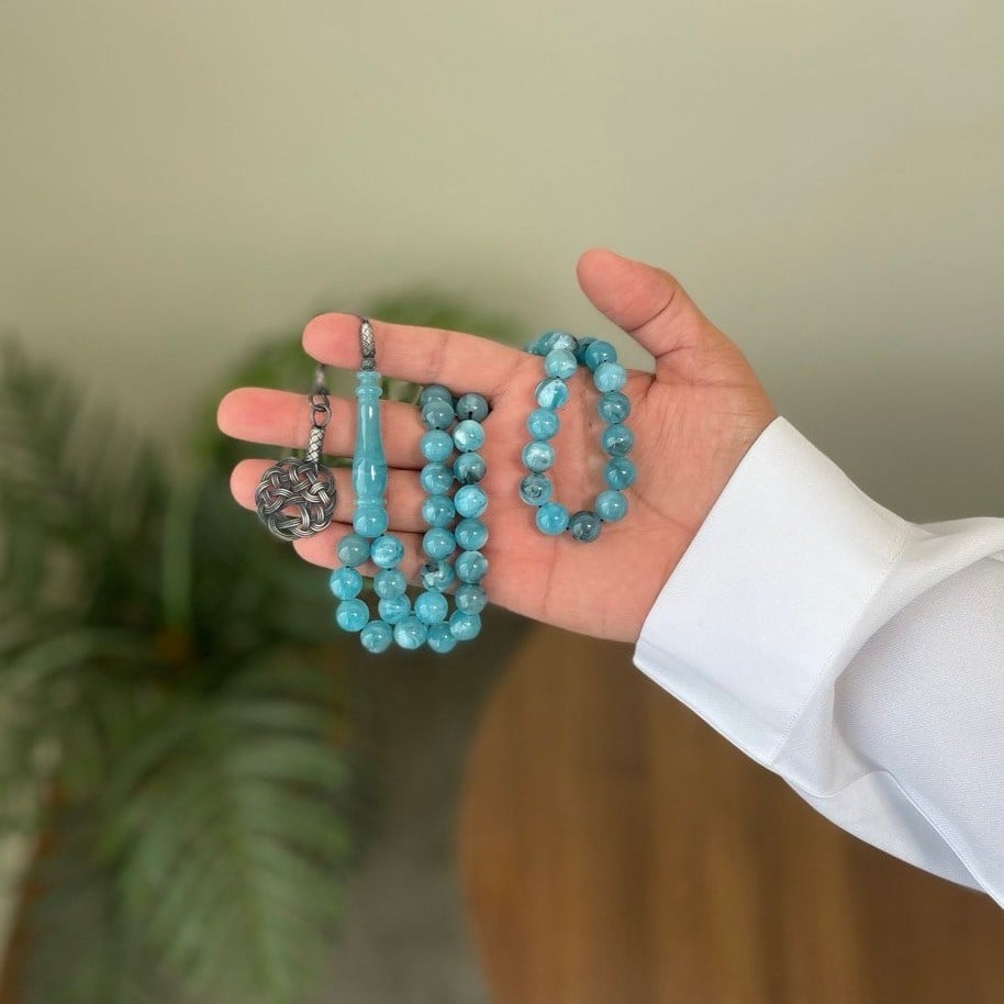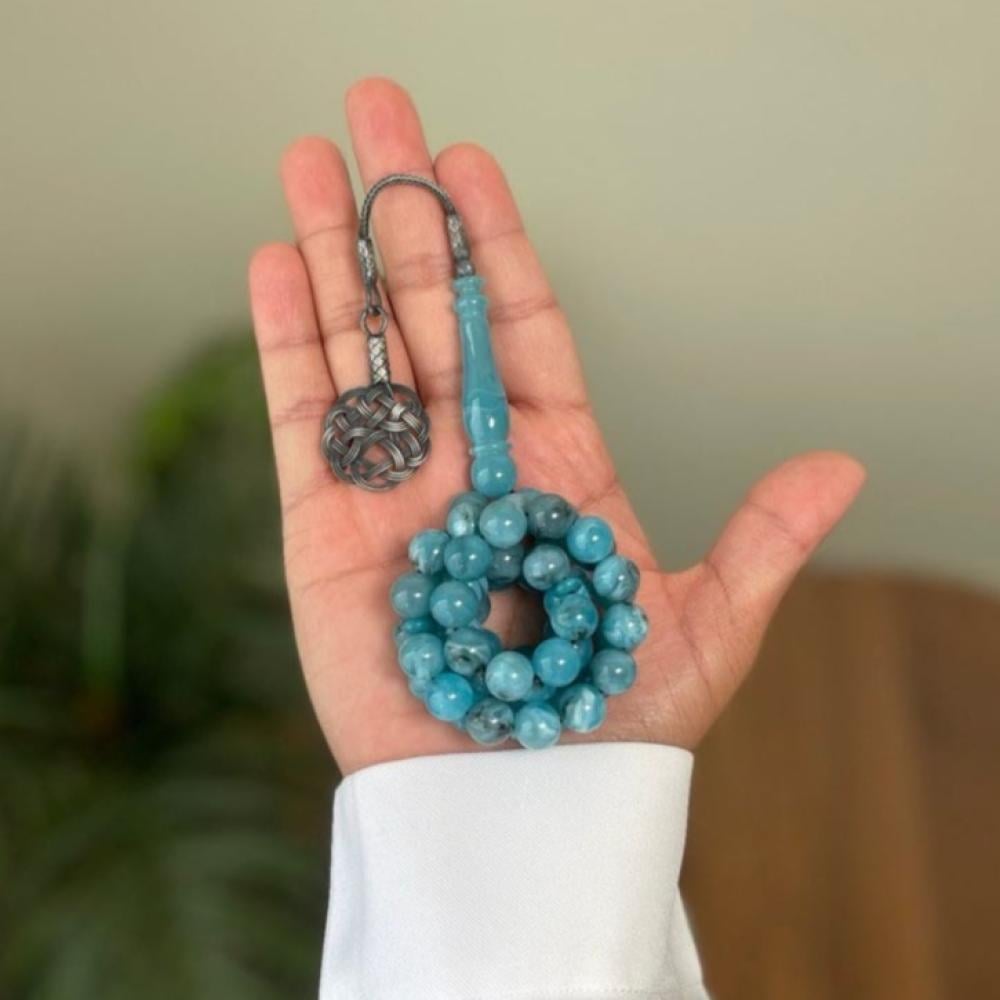 سبحة البكلايت خفيفة الوزن مصممة للاستخدام اليومي، تتميز بتصميم مريح وأنيق، عليها طربزونة تركية من الفضة مما يعطي السبحة جمال وفخامة.