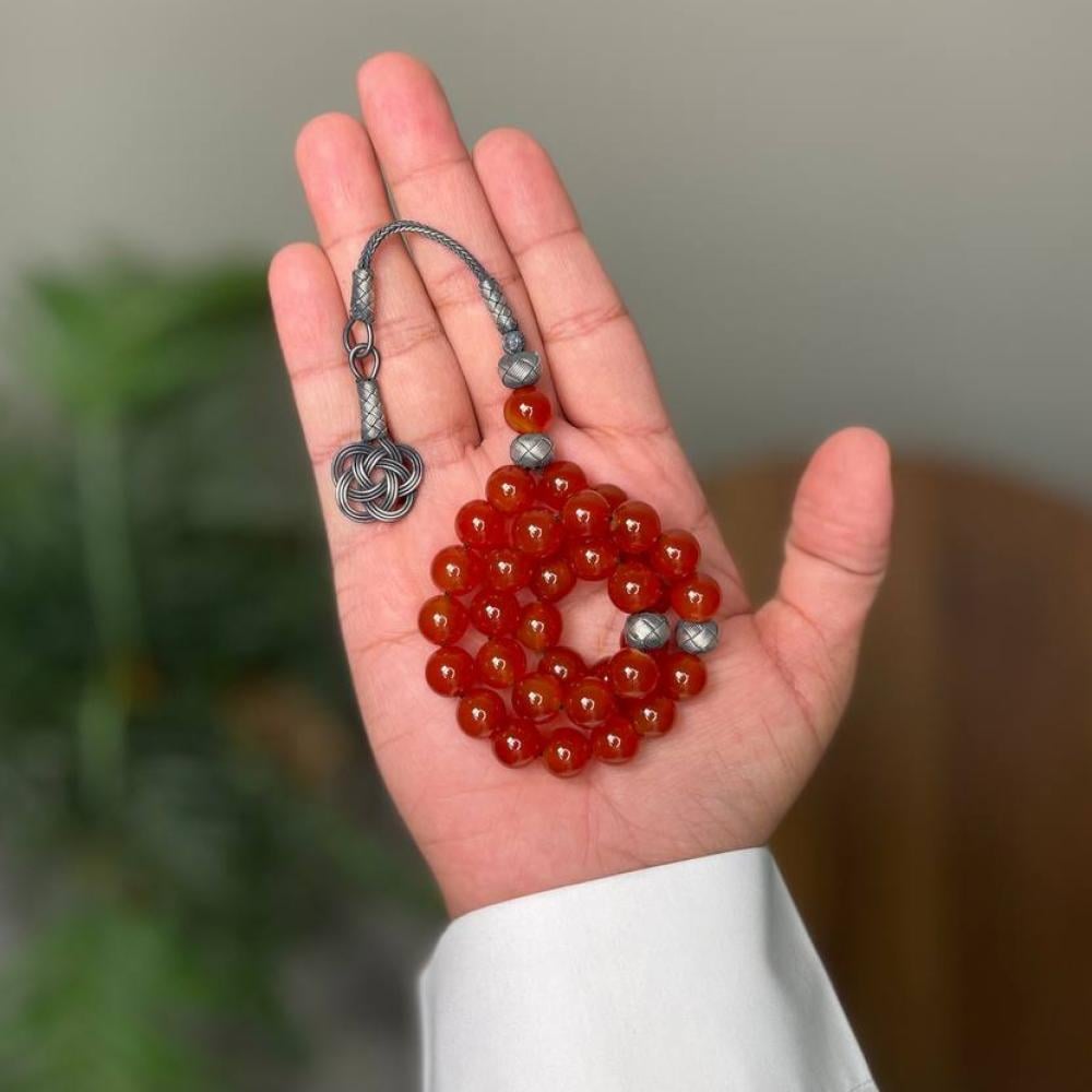 مسباح حجر العقيق الأحمر، مخروط من حجر العقيق الأحمر الطبيعي، مسباح ثقيل وفاخر ، ذو ألوان مميزة ، يزينة طرابزونة من الفضة مع أربع فواصل فضية لتضيف فخامة وأناقة للسبحة، مسباح من الحجر الطبيعي مناسب للإهداء والمناسبات.