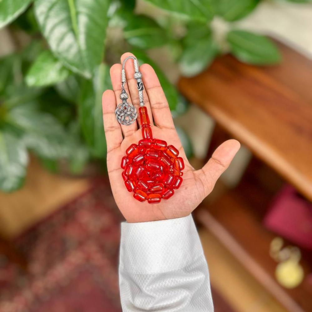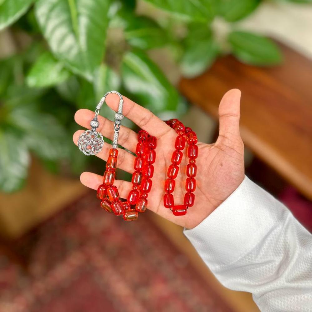 المسباح الزعفراني مسباح فاخر من خامة إيرانية ذات رائحة زعفرانية ثابتة ،مخروط يدويا بجودة عالية، مسباح رسمي وفخم للإهداء والمناسبات, عليها طربزونة تركية من الفضة مما يعطي السبحة جمال وفخامة.