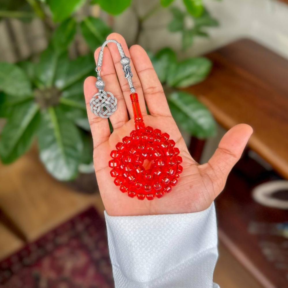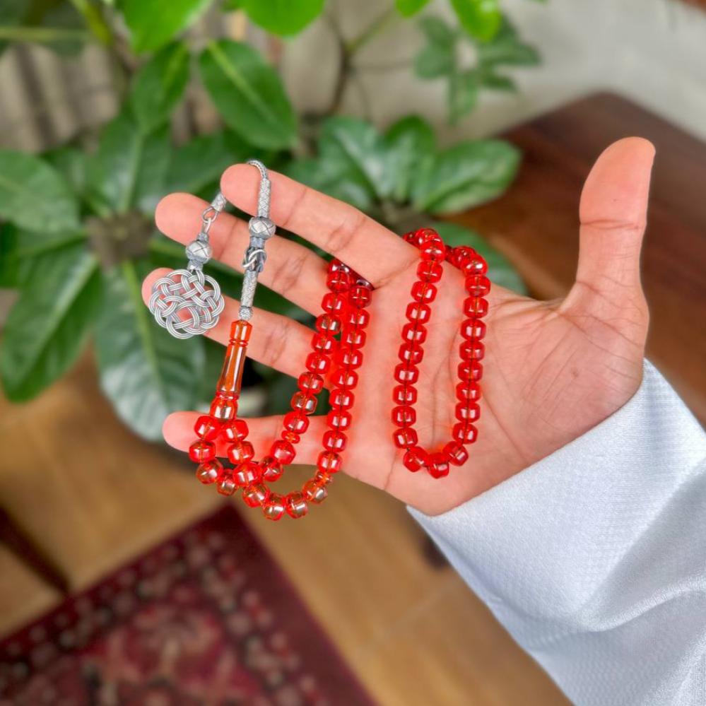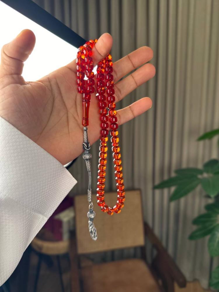 المسباح الزعفراني مسباح فاخر من خامة إيرانية ذات رائحة زعفرانية ثابتة ،مخروط يدويا بجودة عالية، مسباح رسمي وفخم للإهداء والمناسبات, عليها طربزونة تركية من الفضة مما يعطي السبحة جمال وفخامة.