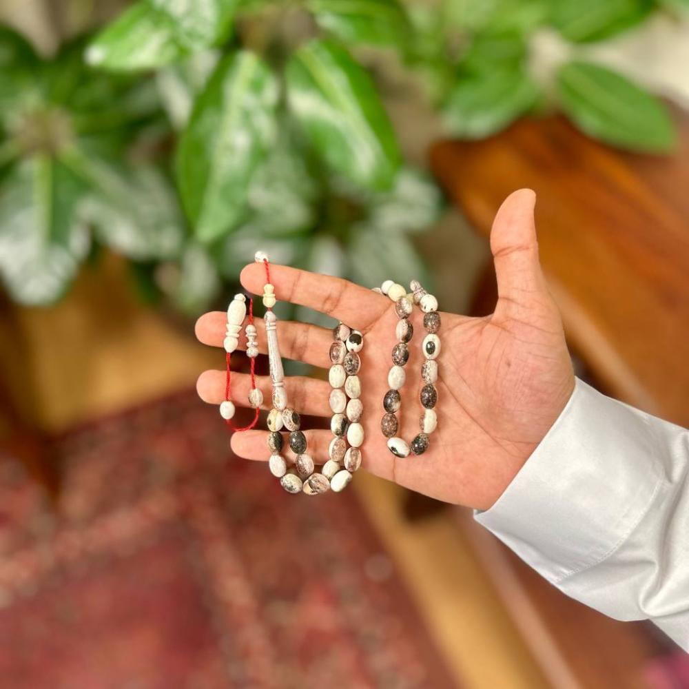 مسباح فاخر مخروط من قرن الغزال، يتميز بندرة الخامة، والخراطة اليدوية، مناسب للهواة ومحبي السبح، عليه تمليكة من نفس نوع الخرز مما يعطي السبحة فخامة وأناقة.